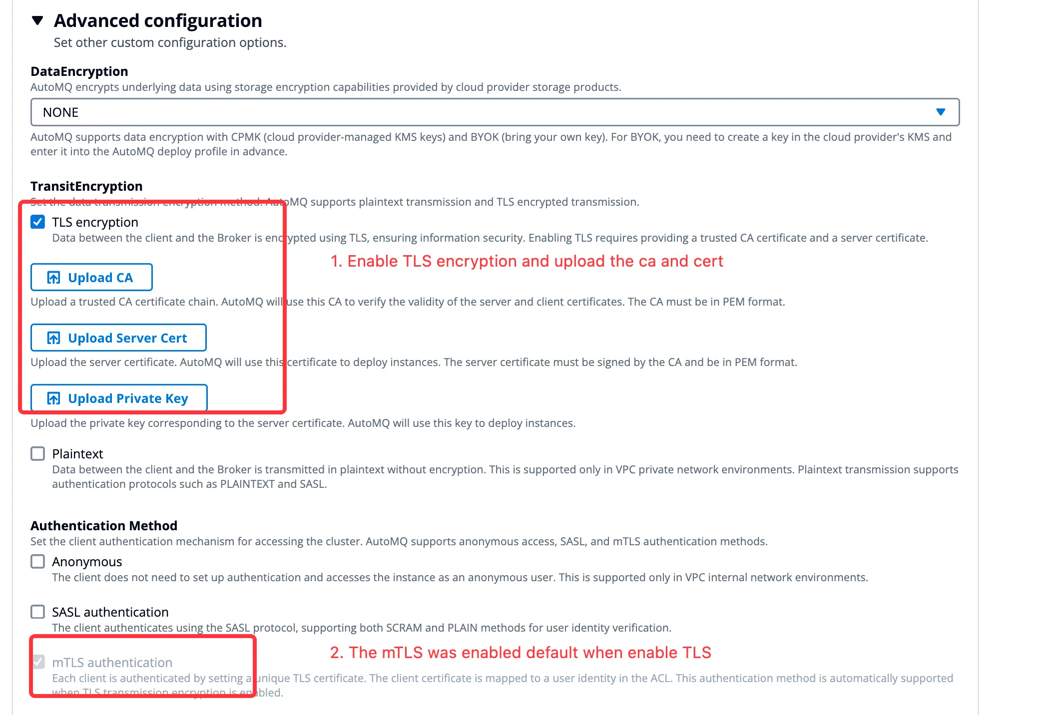 For mTLS, click on Advanced Options >> Enable the following parameters when creating the instance. Refer to the interface diagram below: