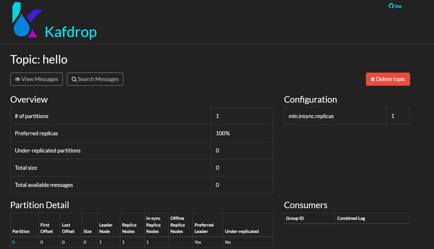Kafdrop [1] 是一个为 Kafka 设计的简洁、直观且功能强大的 Web UI 工具。它允许开发者和管理员轻松地查看和管理 Kafka 集群的关键元数据,包括主题、分区、消费者组以及他们的偏移量等。通过提供一个用户友好的界面,Kafdrop 大大简化了 Kafka 集群的监控和管理过程,使得用户无需依赖复杂的命令行工具就能快速获取集群的状态信息。 得益于 AutoMQ 对 Kafka 的完全兼容,因此可以无缝与 Kafdrop 进行集成。通过利用 Kafdrop,AutoMQ 用户也可以享受到直观的用户界面,实时监控 Kafka 集群状态,包括主题、分区、消费者组及其偏移量等关键元数据。这种监控能力不仅提高了问题诊断的效率,还有助于优化集群性能和资源利用率。 这篇教程会教你如何启动 Kafdrop 服务,并将其与 AutoMQ 集群搭配起来使用,实现集群状态的监控和管理。